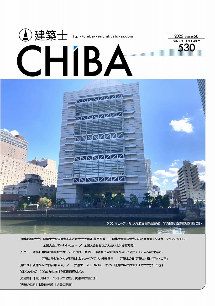 ◆特集 ・~未来の建築士と新しい風~ 「R6 年度総合資格学院合格者祝賀会」における活動報告 ・「千葉BIM ワークショップ2024」千葉BIM ワークショップ:建築の未来を体験する ◆スキルアップ ・基準法であそぼ!「ショッピングモールの階段、なんでこんなに多いの?!」 ◆リポート・寄稿 ・法改正(令和7年4月1日)の円滑施行に向けて ・今回で最後のヘリテージマネージャー基礎講座を受講した備忘録 ・中小企業診断士カッシーに聞け! #11~建設DX の第一歩3D スキャナー~ ・~弁護士アジローがゆく~#19「人間みんな大統領!の巻」 ・表紙の説明 ・会員の動静 ・編集後記 |