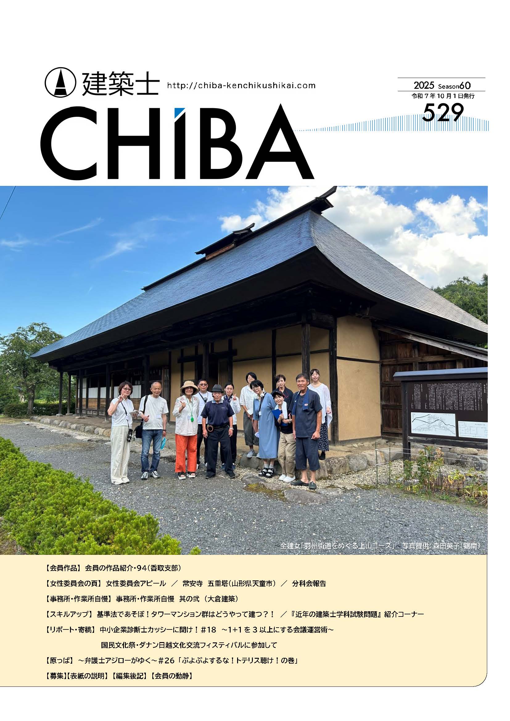 ◆特集:常設委員会紹介 ・総務委員会 ・事業委員会 ・広報委員会 ・青年委員会 ・女性委員会 ・景観まちづくり委員会 ・建築相談室 ◆募集 ・「私の!うちの!事務所・作業場自慢」 ◆青年委員会の頁 ・支部の皆さまと10都県の青年同志への感謝 関東甲信越建築士会ブロック会青年協議会 東京大会 ・松戸支部のパスタブリッジ~その先にあるもの~ 関東甲信越建築士会ブロック会青年協議会 東京大会 ◆原っぱ ・~弁護士アジローがゆく~#23「オッケェイ、我が命にかえても!の巻」 ◆行政コーナー ・令和7年度千葉県県土整備部建築指導課の事務分掌について ・令和7年度建築指導課 各担当地域一覧表 ・令和7年度千葉県出先機関建築担当職員担当区域・事務 ・千葉県建築文化賞について ◆リポート・寄稿 ・中小企業診断士カッシーに聞け!#15 ~言葉の定義を揃える~ ・千葉県建築学生賞に参加して ◆スキルアップ ・基準法であそぼ!「高架下は都市の中の“隠れ資源”?!」 ・表紙の説明 ・会員の動静 ・編集後記 |